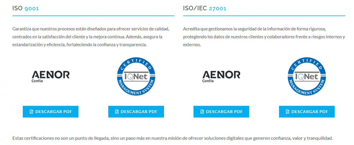 Esto sigfnifica, cara a nuestros clientes, que nuestros servicios a partir de este momento están de alguna manera, protegidos con una norma que hace que seamos más fiables, más seguros y más transparentes debido a que los mismos han sido auditados, documentados y optimizados.